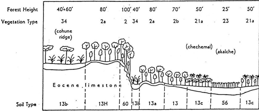 Profile showing relation of vegetation type to topography, soil, and parent material in northwest Belize (from Wright et al. 1959; see above or on Publications page in this website).