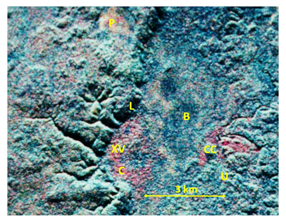 Vegetation types, ancient Maya sites, and a tourist lodge. Compare details in this AIRSAR image with details in Profile (at bottom of page) and see Environment and vegetation page in this website.