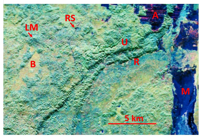 Vegetation types, agriculture, ancient Maya site, and a research station. Compare details in this AIRSAR image with details in Profile (at bottom of page) and see Environment and vegetation page in this website.