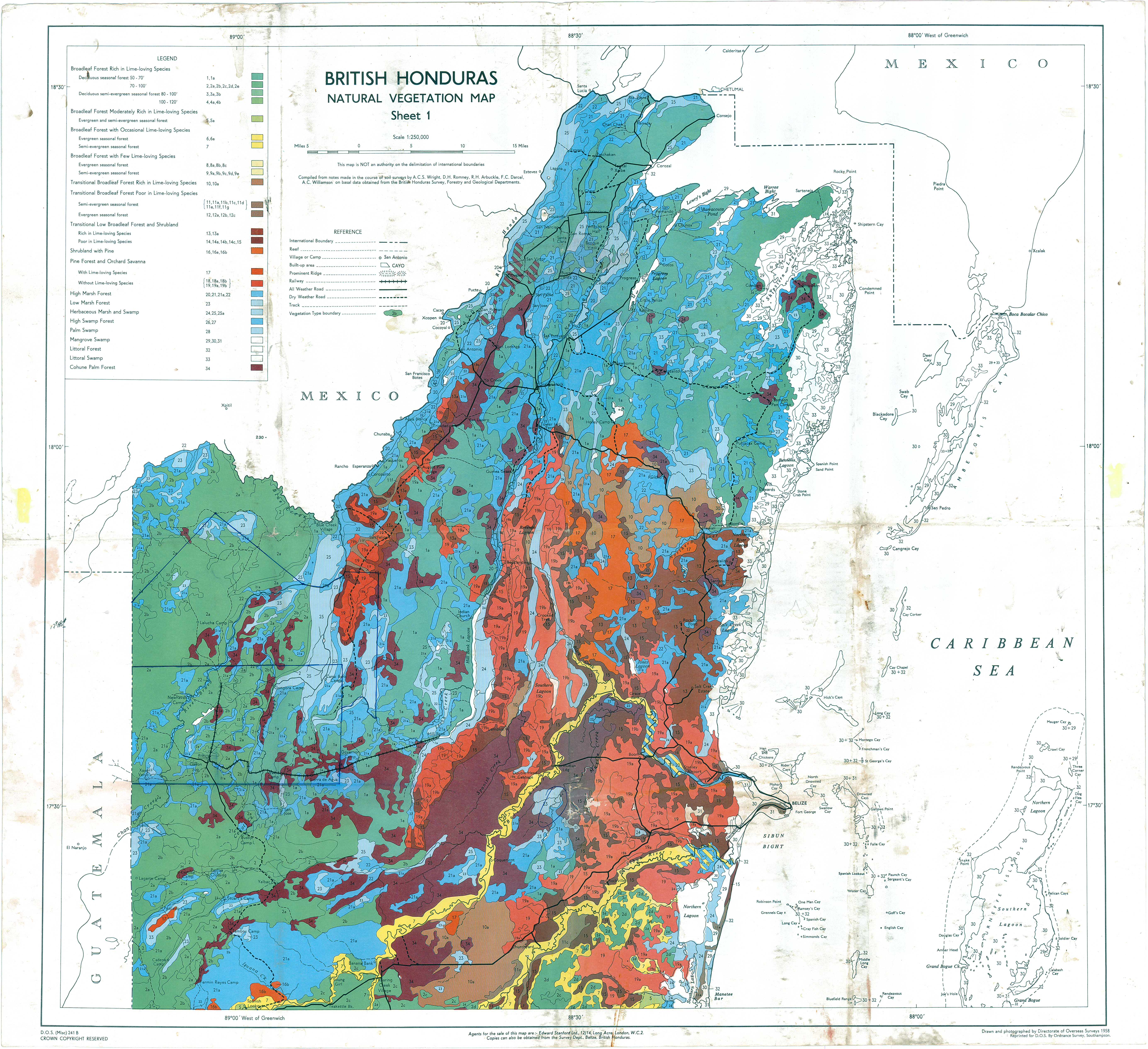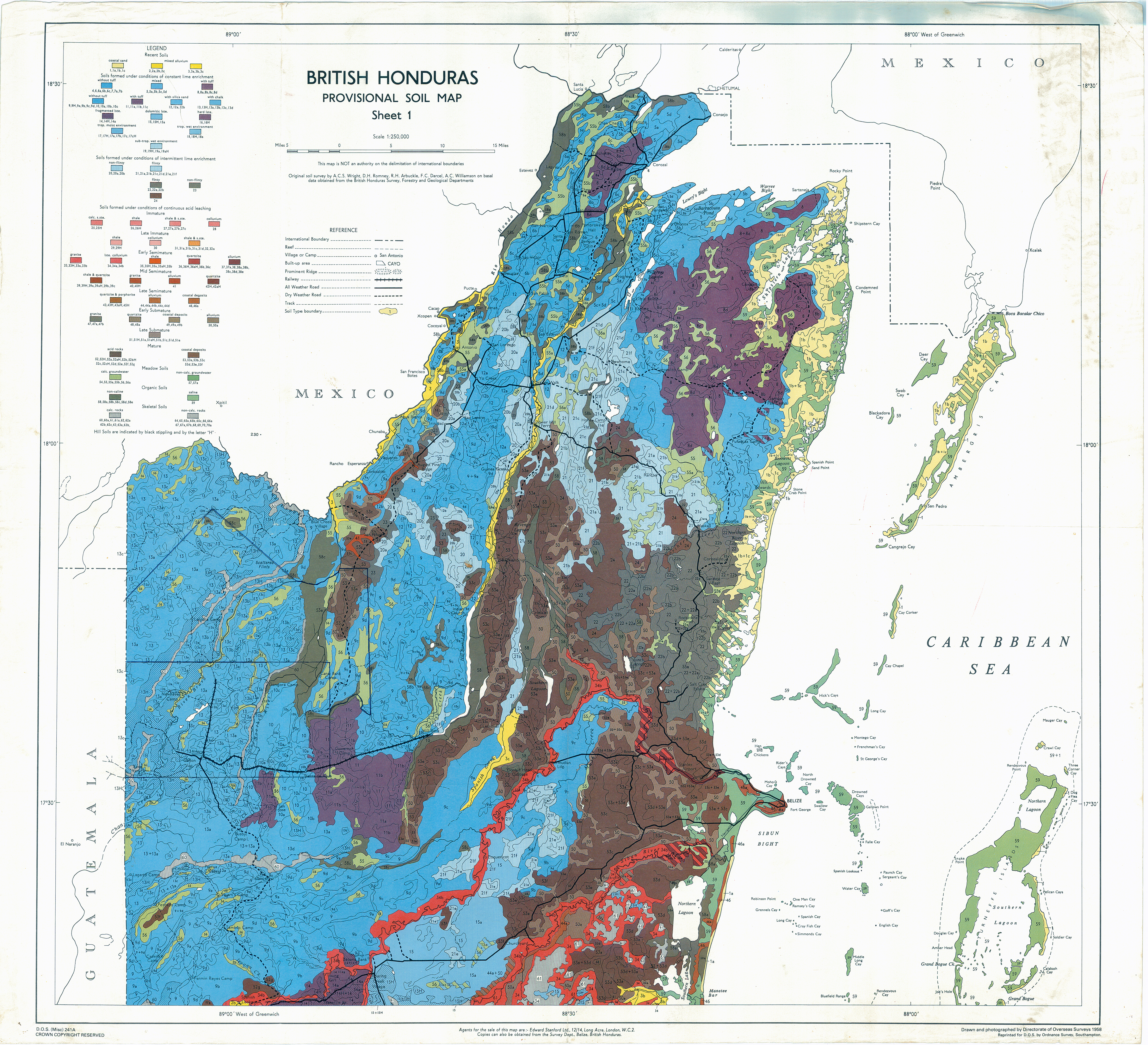 Maps used with permission. Maps were published in connection with: Wright, A. C. S., D. H. Romney, R. H. Arbuckle, and V. E. Vial. 1959. Land in British Honduras. Colonial Research Publication No. 24. Her Majesty’s Stationery Office [The National Archives], Surrey, UK.